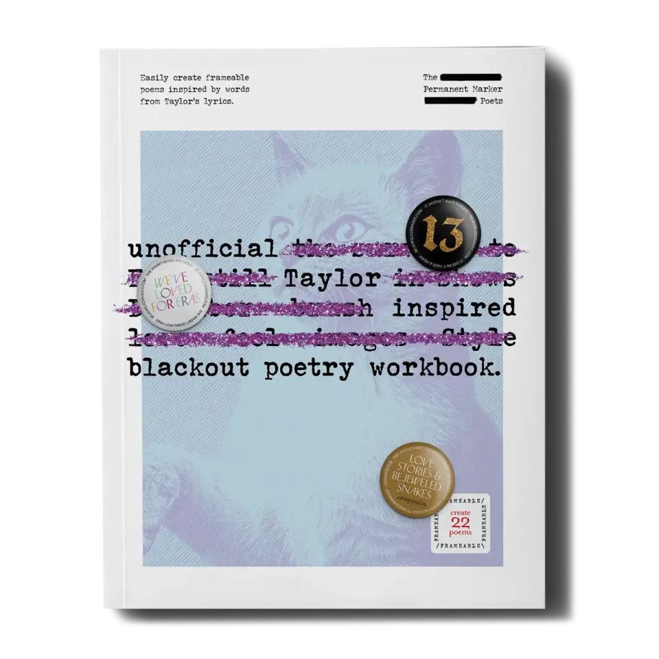 Challenge your creativity and generate 22 frameable poems inspired by words from Taylor Swift’s music. Blackout or found poetry is a captivating form of art that involves editing a page of existing text by blacking out unwanted words—creating an original poem. It’s the perfect outlet for self expression that combines your love of poetry and Taylor.
